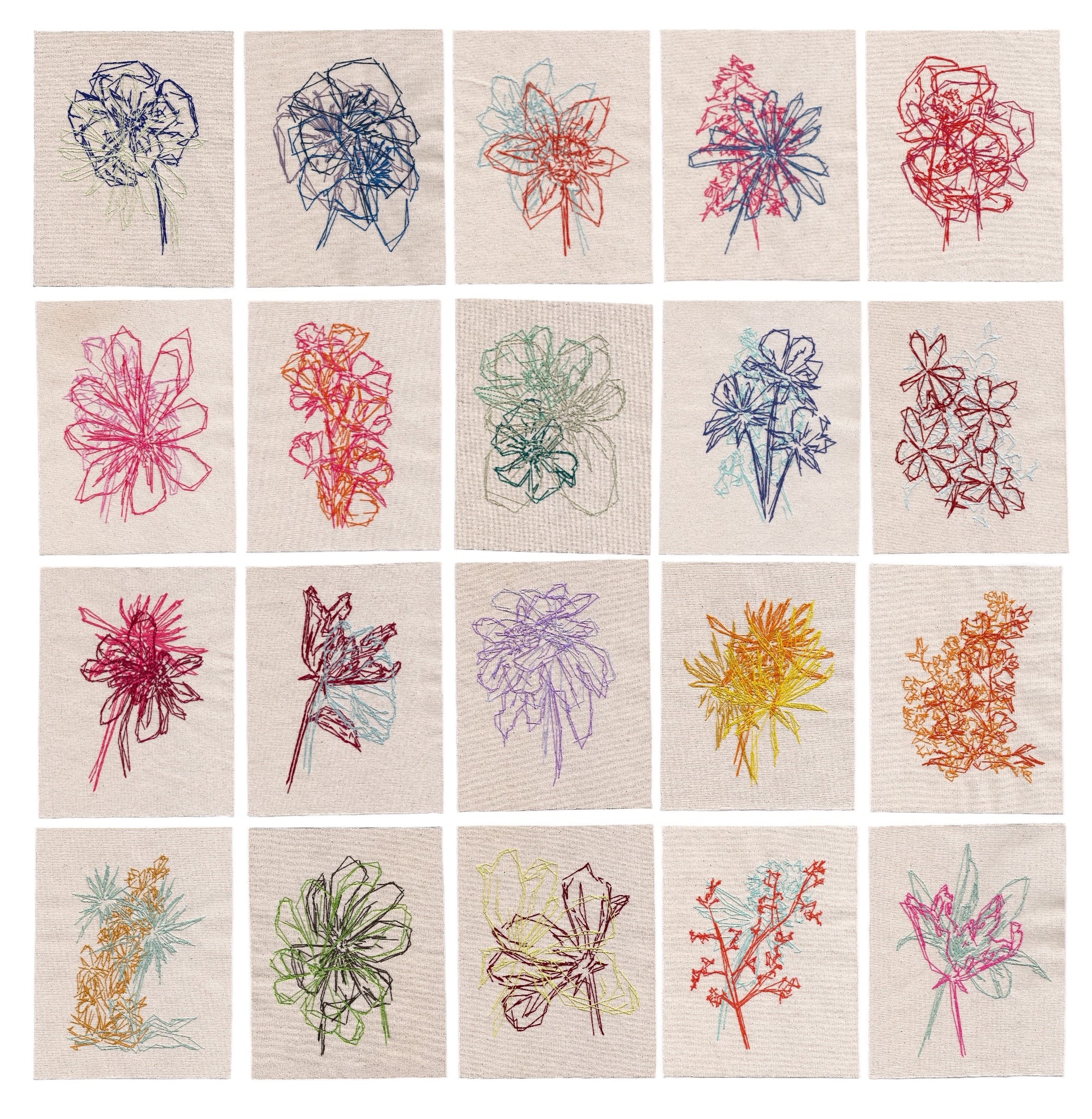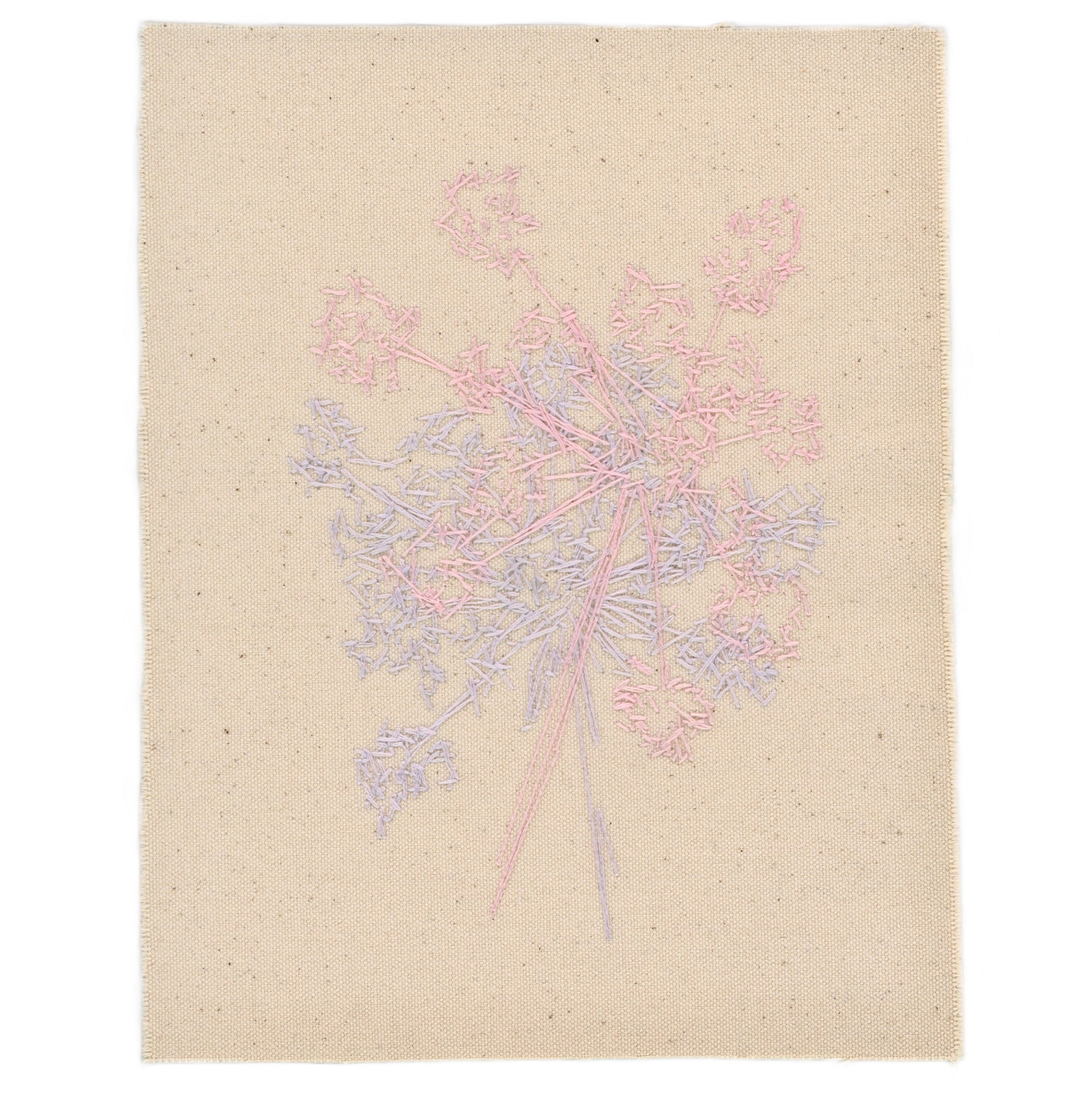 A hand sew artwork of Spring Flora on raw canvas with cotton thread